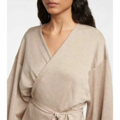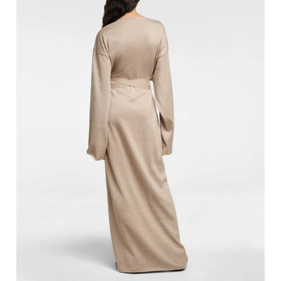 The Aras dress spotlights The Row’s revered simplicity. Made from a stretchy blend of wool, silk, and cashmere, this streamlined piece has a notched V-neckline, draped sleeves, and a wrap skirt.