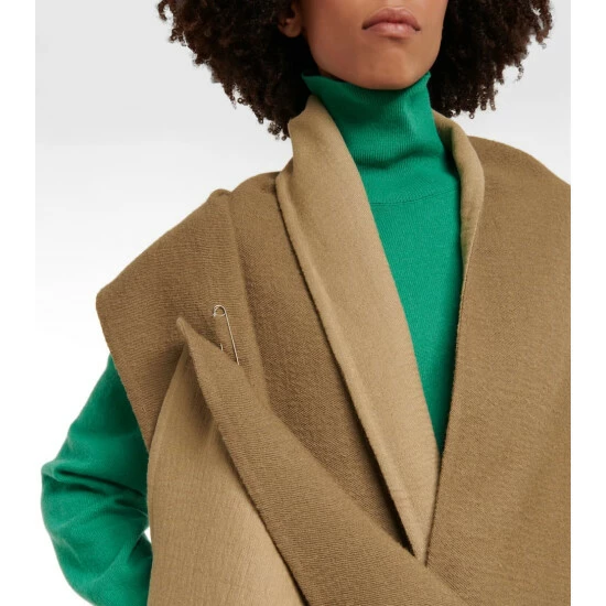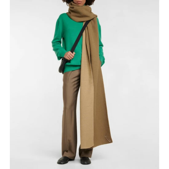 The Bisbee scarf from The Row is cut in a rectangular silhouette from a double-faced Baby Suri wool-blend. This style has double layer construction and a metal safety pin detail.