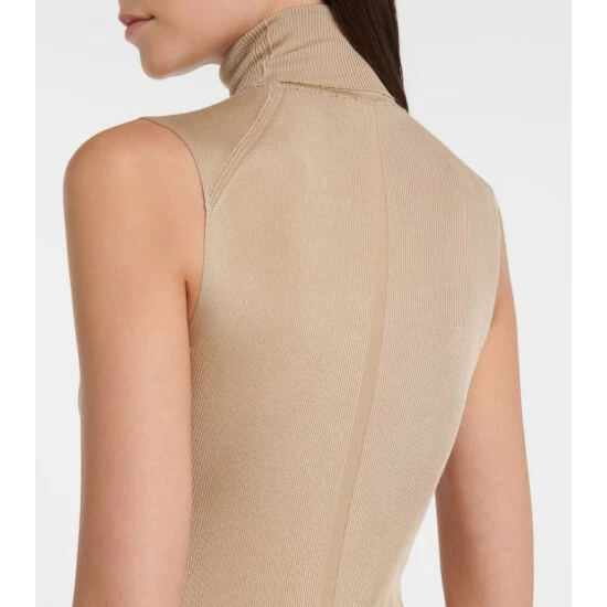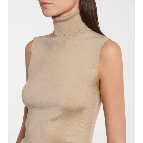 The Row’s beige Desio top is made from a ribbed silk knit. Featuring a turtleneck, it’s a sleeveless design with a straight hem.