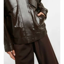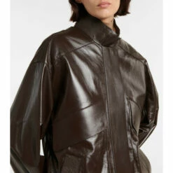 The Row’s Efren jacket combines a bomber silhouette with a luxurious lambskin leather fabrication. It has dropped shoulders, oversized patch pockets, and elastic panels at the waist that create a rounded shape.
