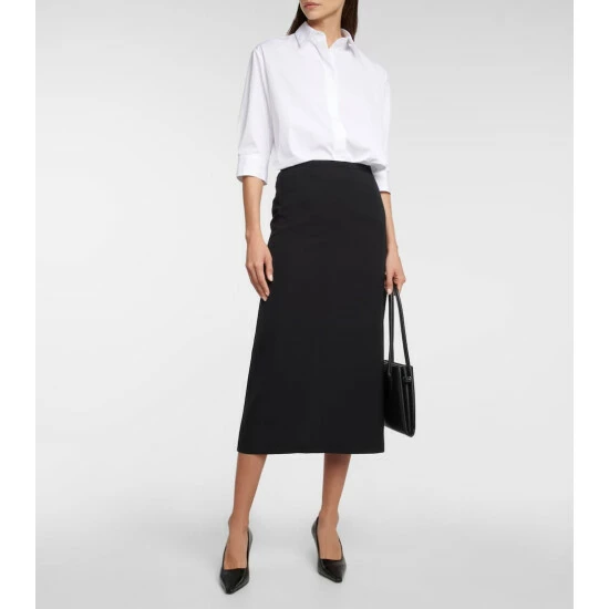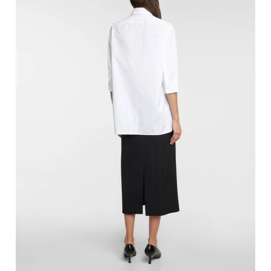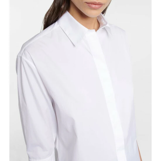 The Row’s Elada shirt is made from a crisp cotton poplin. It has a sharp collar, a concealed button placket, and elbow-length sleeves.