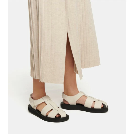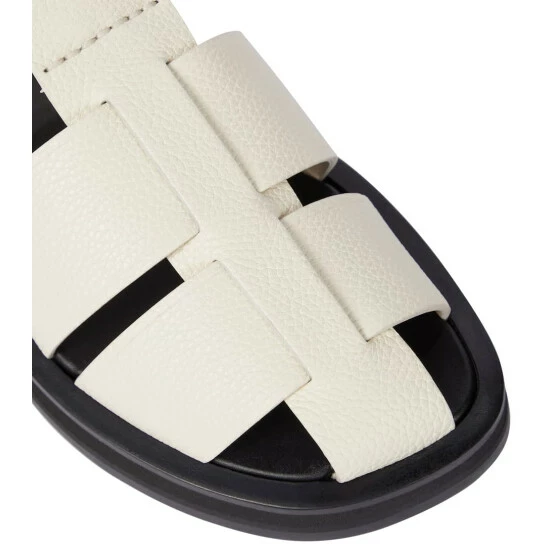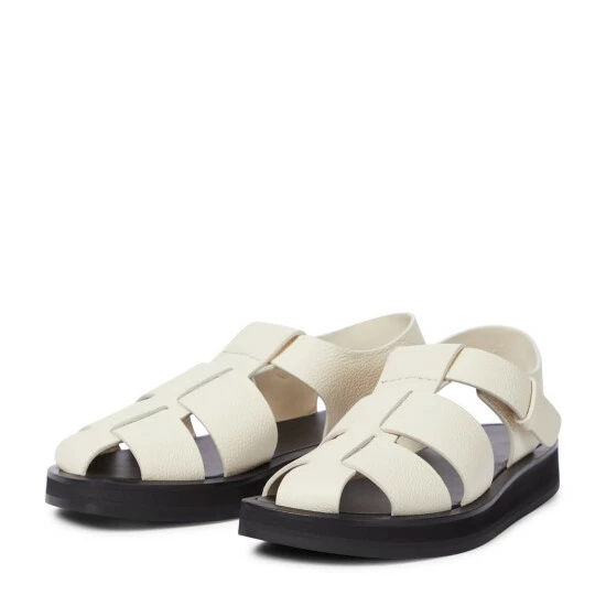 The Fisherman sandals from The Row are aptly named – their woven cage straps are a subtle reference to maritime netting. In ivory white, they’re crafted from grained calfskin leather with buckled straps for a secure fit. Raised rubber soles ensure comfort with every step.
