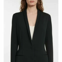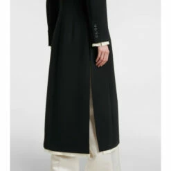 The Row’s Kita coat combines a classic silhouette with a contemporary fabrication. Made entirely from scuba, it has a shawl collar, a fitted waist, and a crinkled lining that shows at the hem and sleeves.