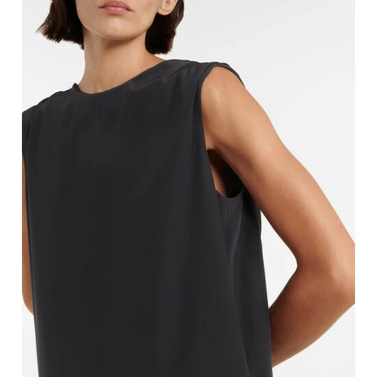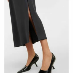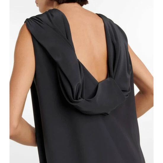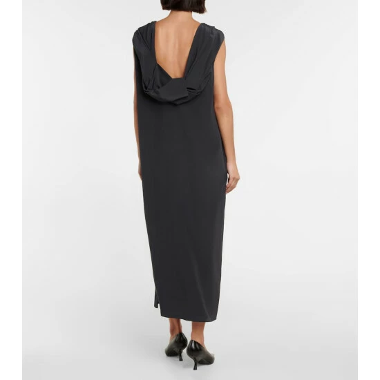 The Row’s Larisa dress has a classic column silhouette with a draped cowl detail at the low-cut back. It’s made from dark gray silk crêpe and has vented sides.