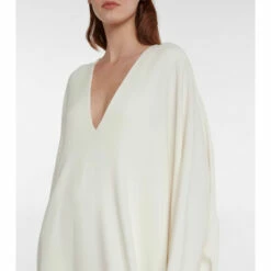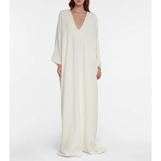 The Meelo gown from The Row reflects the label’s sophisticated and minimalist outlook. It’s made from silk cady for a fluid drape, enhanced with a floor-sweeping hemline and wide sleeves.