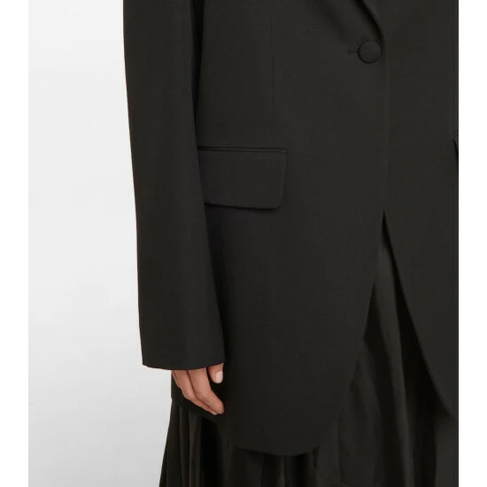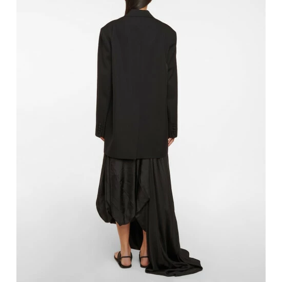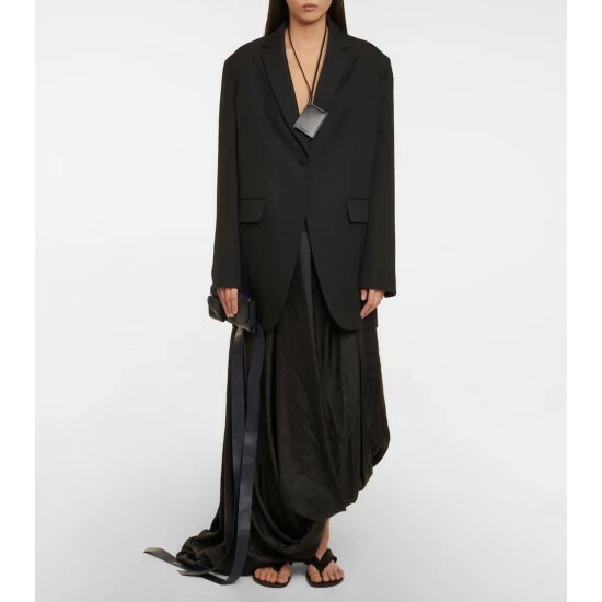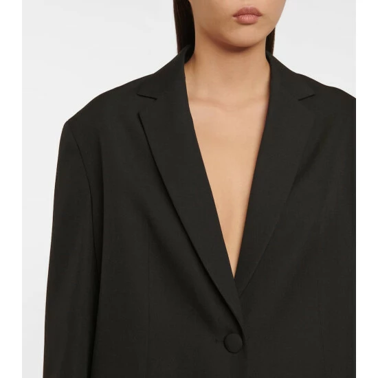 The Row’s Obine blazer in an oversized design made from structured wool with a single-button front. Great attention to detail is shown in the hand-pick stitched lapels, the front flap pockets and the placement of the vent.