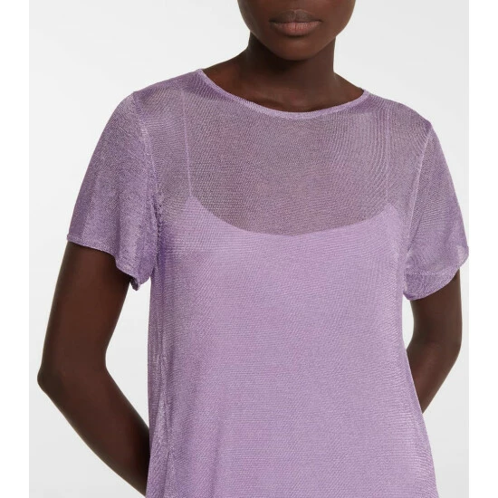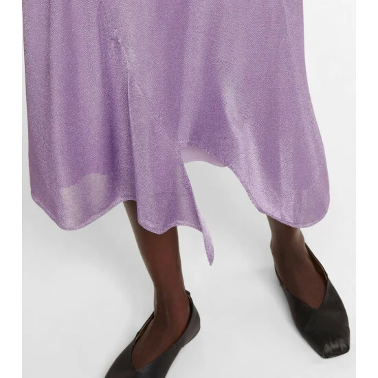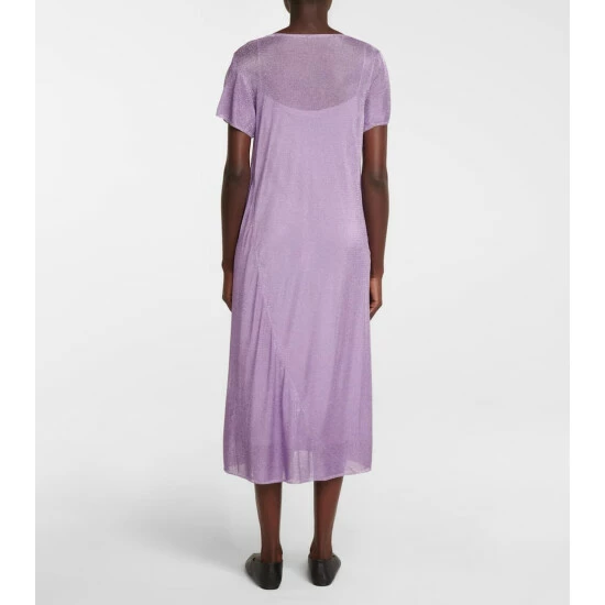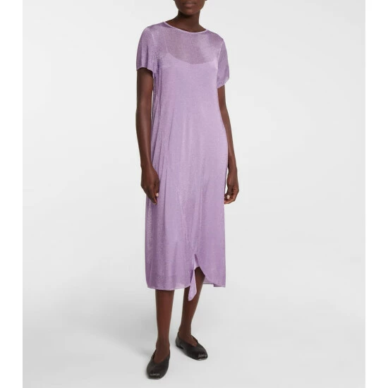 The Pasol dress from The Row is made from shimmering metallic knit fabric into a relaxed, flowy silhouette with short sleeves and asymmetric hems, and features a lilac slip dress for a more comfortable fit.