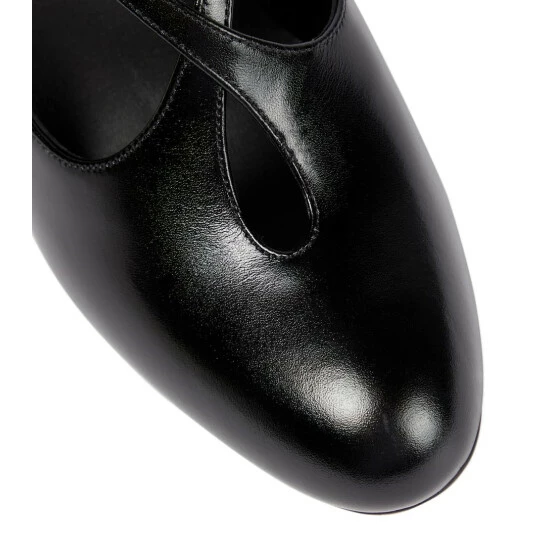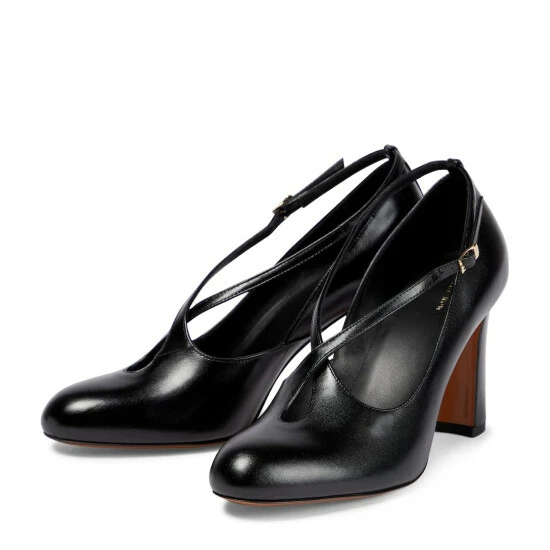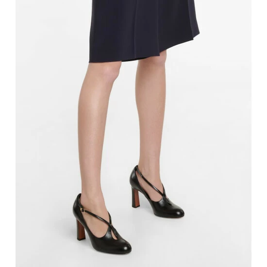 The Spencer pumps from The Row have cross-over straps and keyhole detailing. They’re made from smooth leather and set atop flared heels.