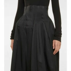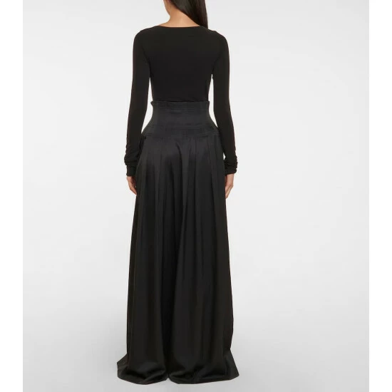 The Row presents a feminine take on tailoring with the Trude pants. They’re cut from black silk and wool with wide legs and a high waist that is boned for a corsetry-inspired fit.